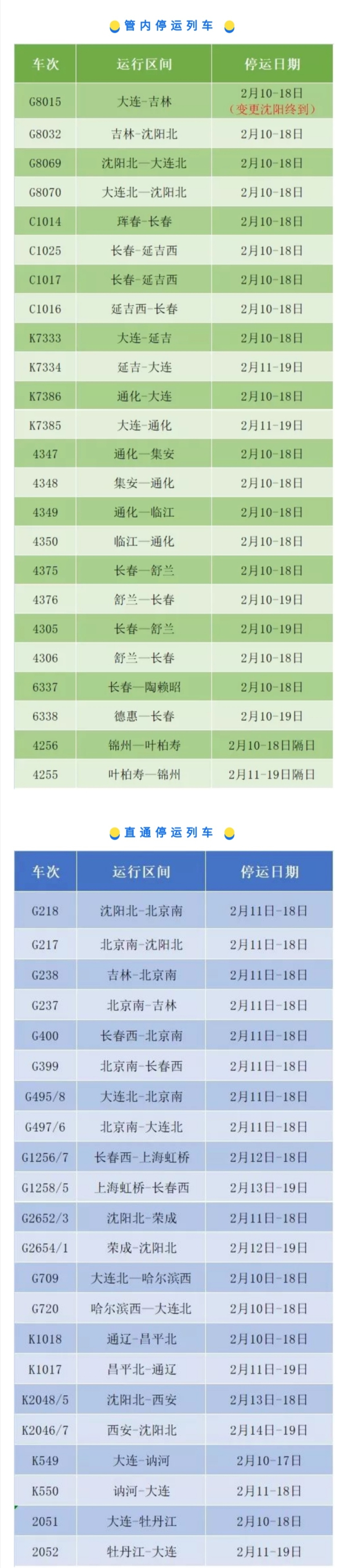 2月10日,中国吉林网从沈阳局集团公司获悉,为应对疫情防控,沈阳局集团公司根据旅客出行需求变化调整优化列车开行方案,对部分旅客列车采取临时停运措施。