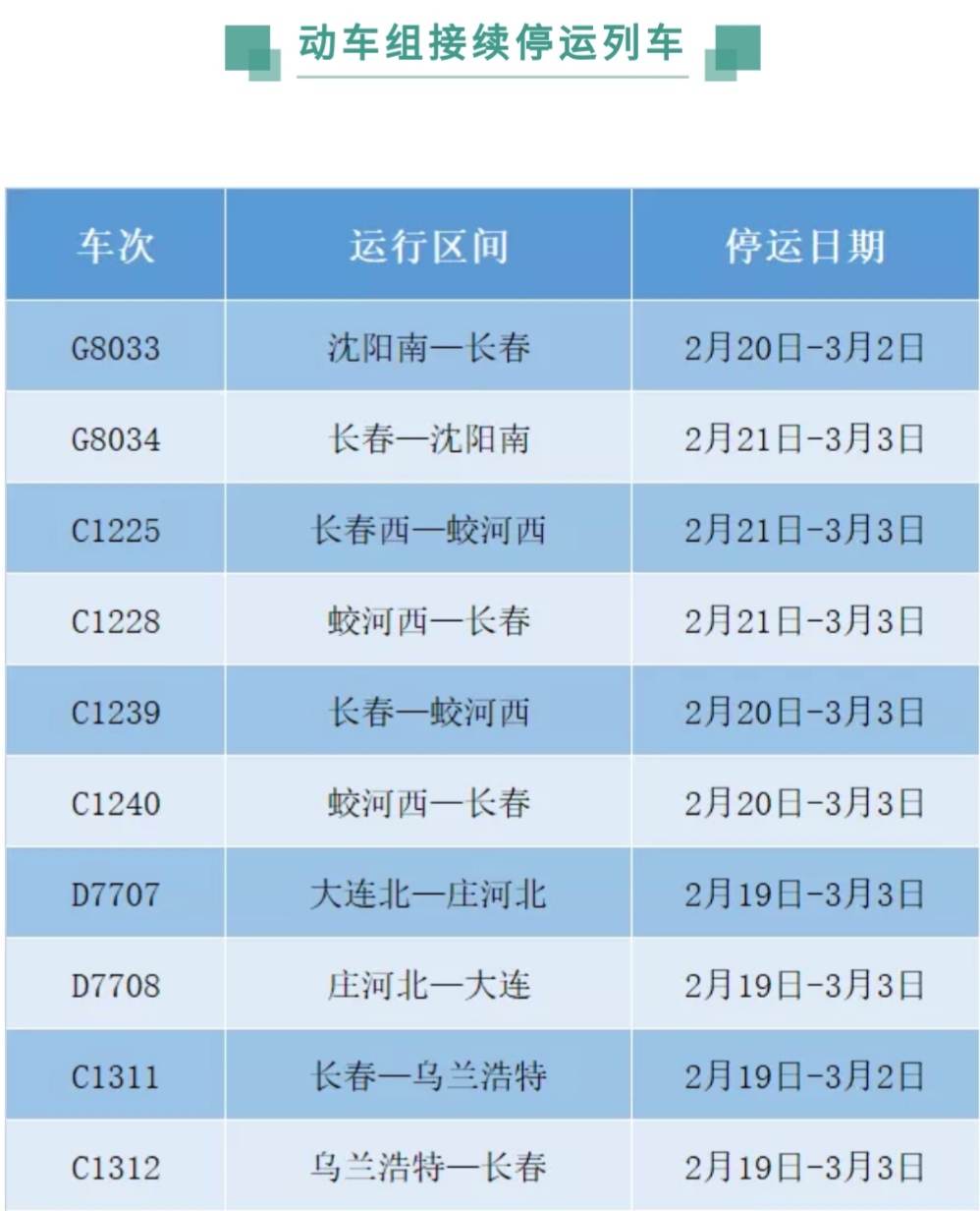 为应对疫情防控,沈阳局集团公司根据旅客出行需求变化,调整优化列车开行方案,对部分旅客列车采取接续停运措施。