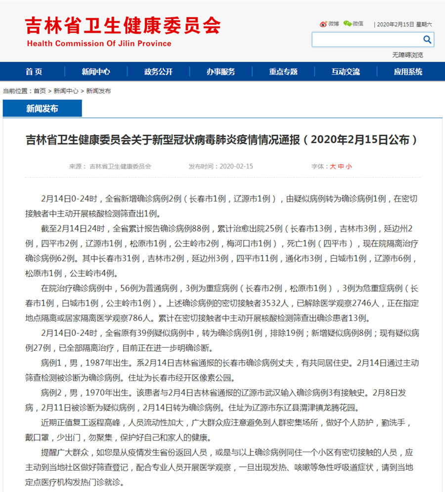 截至2月14日24时,全省累计报告确诊病例88例,累计治愈出院25例(长春市13例,吉林市3例,延边州2例,四平市2例,辽源市1例,松原市1例,公主岭市2例,梅河口市1例),死亡1例(四平市),现在院隔离治疗确诊病例62例。其中长春市31例,吉林市2例,延边州3例,四平市11例,通化市3例,白城市1例,辽源市6例,松原市1例,公主岭市4例。