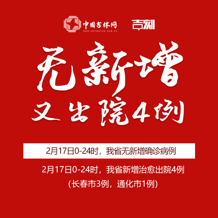 2月17日0-24时,我省无新增确诊病例。 2月17日0-24时,我省新增治愈出院4例(长春市3例,通化市1例)。