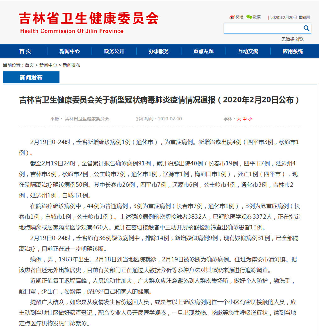 截至2月19日24时,全省累计报告确诊病例91例,累计治愈出院40例(长春市19例,四平市7例,延边州4例,吉林市3例,松原市2例,公主岭市2例,通化市1例,辽源市1例,梅河口市1例),死亡1例(四平市),现在院隔离治疗确诊病例50例。其中长春市26例,四平市7例,辽源市6例,公主岭市4例,通化市3例,吉林市2例,延边州1例,白城市1例。