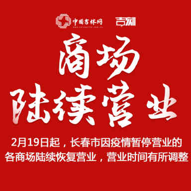 * 商场陆续营业:2月19日起,长春市因疫情暂停营业的各商场陆续恢复营业,营业时间有所调整