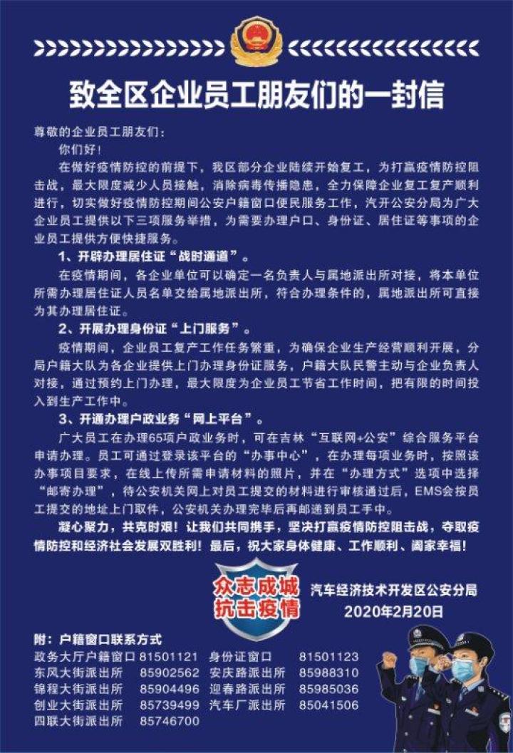 2月20日,长春汽开区公安分局发布《致全区企业员工朋友们的一封信》,为服务企业复工复产,最大限度减少人员接触,消除病毒传播隐患,推出三项服务举措,为需要办理户口、身份证、居住证等事项的企业员工提供方便快捷服务。