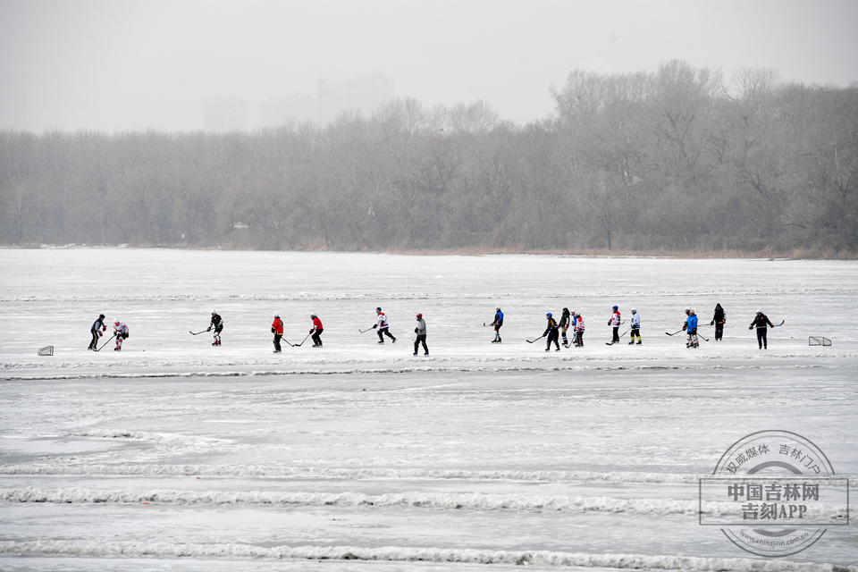 市民们走出家门,在南湖冰面上进行冰球运动。