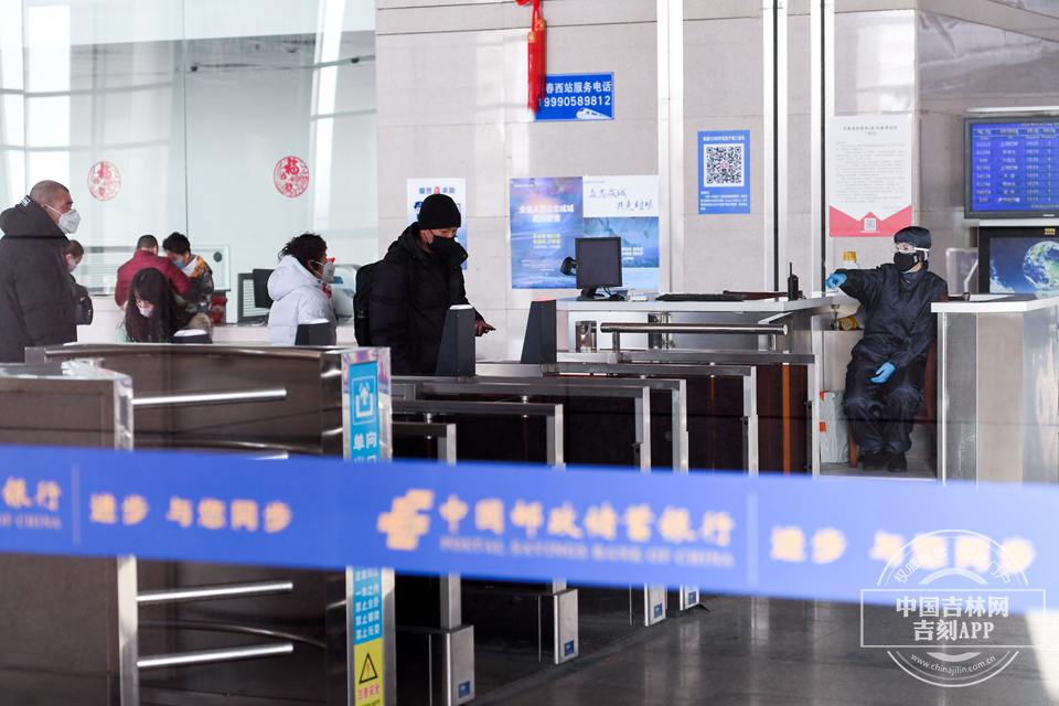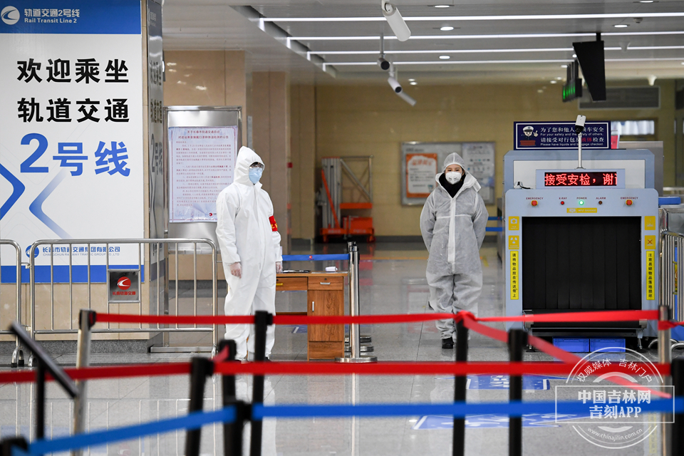 在地铁2号线长春西站换乘入口处,工作人员身穿防护服,对进站乘客进行体温筛查。