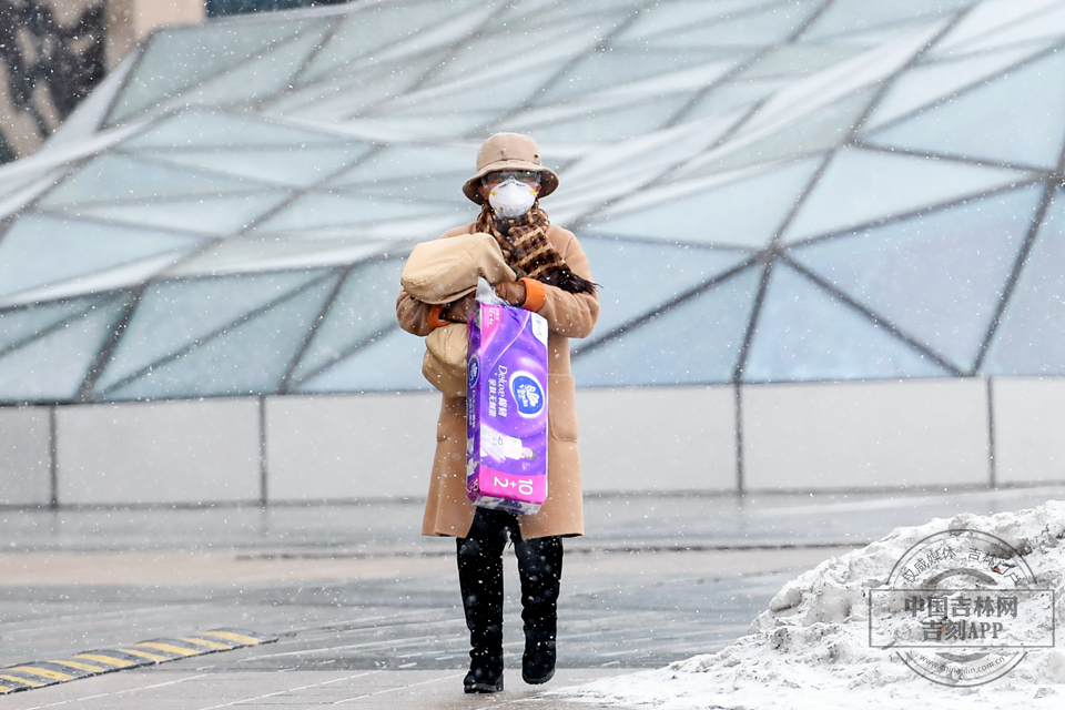 上午11点,长春城区上空飘起雪花,一位女士佩戴口罩和护目镜外出采购生活用品。