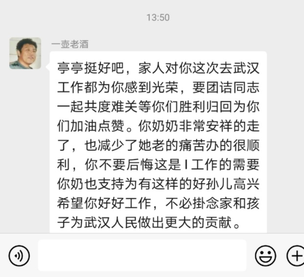 来到武汉的第18天,她突然接到了奶奶去世的消息。当电话打回长春爸爸的手机时,还没有来得及说句安慰的话,就听爸爸说:“家里这边你不用担心,那边的人民更需要你,你好好工作不要分心,保护好自己。”