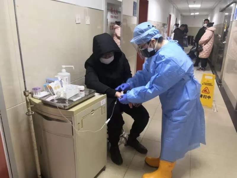 就诊室外排满了戴着口罩候诊的病人和焦虑的家属。王志辉一边安排护士工作,一边安抚患者情绪,她深知这场没有硝烟的战争每一个岗位都是主阵地。发热门诊等待接诊的患者络绎不绝,打条码、采血、试敏、静点、换药、拔针、消毒、接收物资的派送、送标本、取患者药品、迎接检查等工作有条不紊在发热门诊进行着。医护人员像陀螺一样不停地穿梭在病人就诊和排查一线,当窗外的时候夜幕已经降临,春节的街道灯火辉煌......就这样,他们在这个不一样的“除夕”,接收了近70名发热患者。
