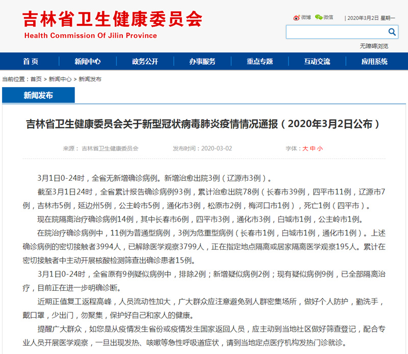 截至3月1日24时,全省累计报告确诊病例93例,累计治愈出院78例(长春市39例,四平市11例,辽源市7例,吉林市5例,延边州5例,公主岭市5例,通化市3例,松原市2例,梅河口市1例),死亡1例(四平市)。