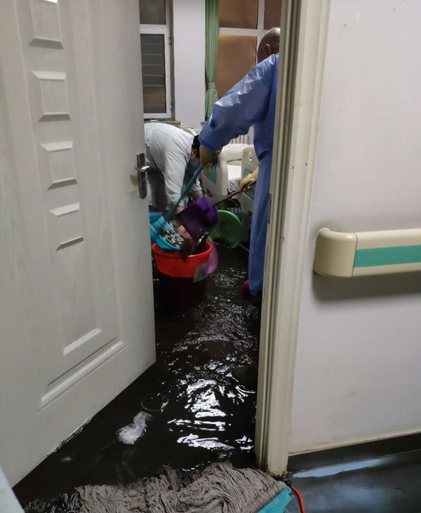 3月1日晚上,疗区一间病房的暖气突然爆裂,水柱冲起来老高,病房里很快就成了“小池塘”。此时,病房里还有4名患者居住。作为疗区主任,郑广翔赶紧行动,一路医护人员打电话找维修工,又安排好另一路值班人员照顾好各病房的病人,自己带着几名医生,赶紧去病房淘水。拖布、盆全上场,连自己的饭盆都用上了。