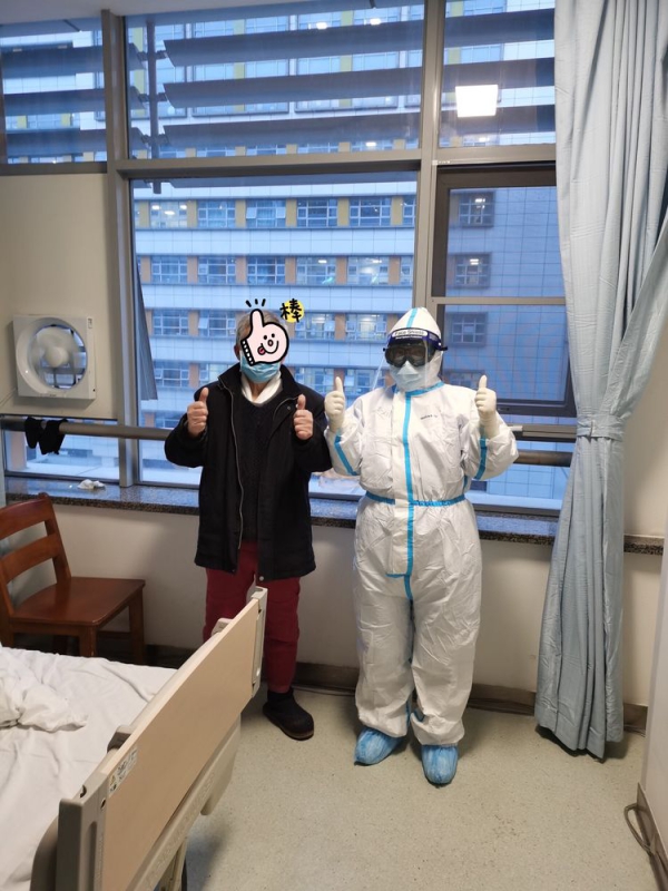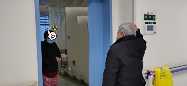 风吹雨打知生活,苦尽甘来懂人生!坚守疫情前线的27天中,感动就像苦尽甘来,无时无刻不包围着我!15床的大爷和18床的大娘是夫妻,由于两人同时感染新冠肺炎一同入院。20多天来,老两口从未见过面。由于大爷不太会用微信,所以只能通过声音进行交流。他们彼此担心、挂念。大娘基础疾病较多,在家都是大爷照顾她多一些,大爷每天担心老伴的病情,在大娘心中,他是精神上的寄托。昨天上班的时候,大娘就跟我念叨:“也不知道你大爷怎么样了,胖了还是瘦了?姑娘你看这些药都是入院的时候你大爷给我准备的!”我看出了大娘的眼睛里写满了思念,为了圆夫妻二人一个小小的梦想,在我的帮助下,他们就这样隔门对视了短暂的几十秒,他们都笑得合不拢嘴,大爷不停地摸着自己的头,像个顽皮的孩子。虽然他们手不能相牵,但心却相印着。这一刻,他们仿佛在诉说:确认过眼神,你就是我遇见的那个对的人。