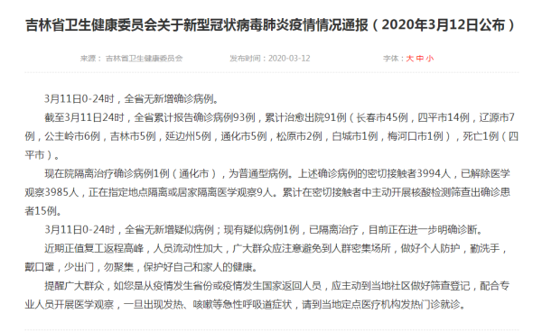 截至3月11日24时,全省累计报告确诊病例93例,累计治愈出院91例(长春市45例,四平市14例,辽源市7例,公主岭市6例,吉林市5例,延边州5例,通化市5例,松原市2例,白城市1例,梅河口市1例),死亡1例(四平市)。
