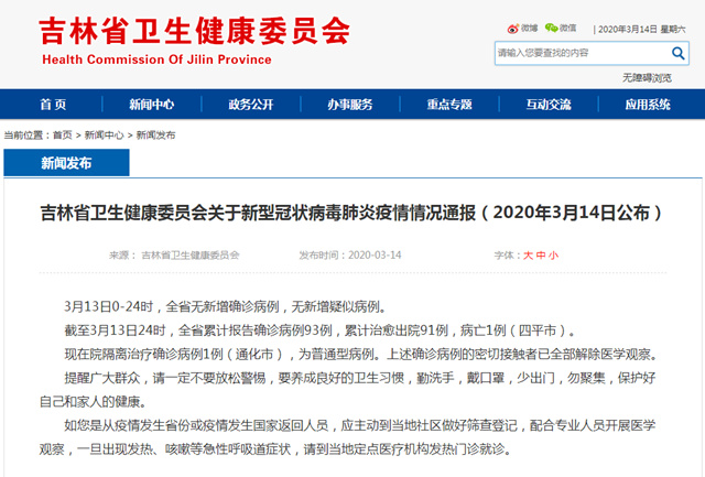 截至3月13日24时,全省累计报告确诊病例93例,累计治愈出院91例,病亡1例(四平市)。