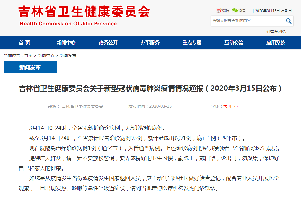 截至3月14日24时,全省累计报告确诊病例93例,累计治愈出院91例,病亡1例(四平市)。