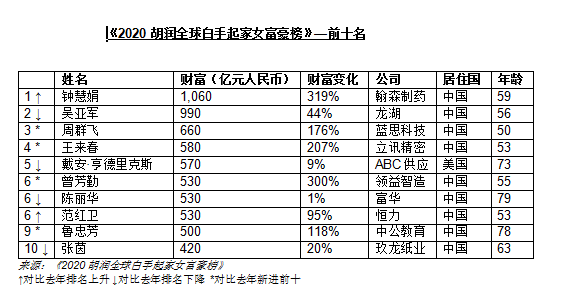 榜单内容显示,精神疾病药企翰森制药59岁的钟慧娟以1060亿元成为全球最成功女企业家;去年的全球白手起家女首富,56岁的吴亚军财富增长44%,以990亿元排名第二。做手机触摸屏的蓝思科技50岁的周群飞,排名第三。