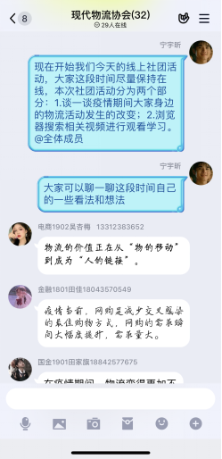 “现代物流协会”是一个结合当代时事热点与自身经历交流学习现代物流知识的专业社团。“这已是我们第三次开展线上社团活动,大家的参与热情高涨。”宁宇昕说,“在这段特殊时期,线上社团活动可以有效增进我们的学习交流,不仅能够激发大家的专业学习热情,同时也能引导大家利用手机、网络获取有用的知识和信息,促进自身学习与成长。”