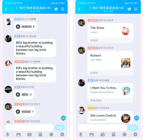 “商务英语演讲社团”的线上活动,可谓是英语达人们的舞台。大家在QQ群里分享自己喜爱的英文歌曲、英文影视作品、英文名人名言,同时通过趣味性的英语小游戏,提高英语学习兴趣。“商务英语演讲社团是吉林外国语大学国际经济贸易学院的英语学习爱好者们自发组建的社团,也是学校‘专业+外语’这一人才培养特色的充分体现。”社团负责人、国际经济与贸易专业大三学生李欣泽介绍说,“我们希望通过社团活动,增进交流,在舒缓线上学习压力的同时,提高英语知识水平。”