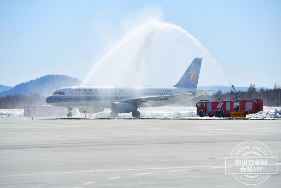 3月29日的长白山机场春和景明,欢迎英雄凯旋的人群翘首以盼,等待着英雄们乘坐的飞机飞抵长白山机场。