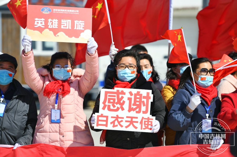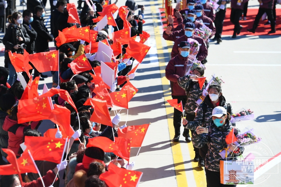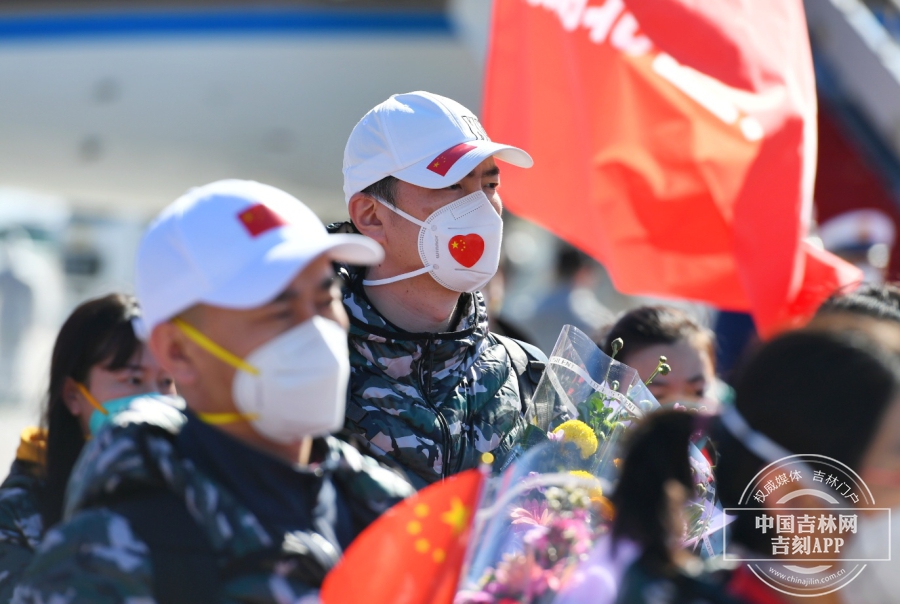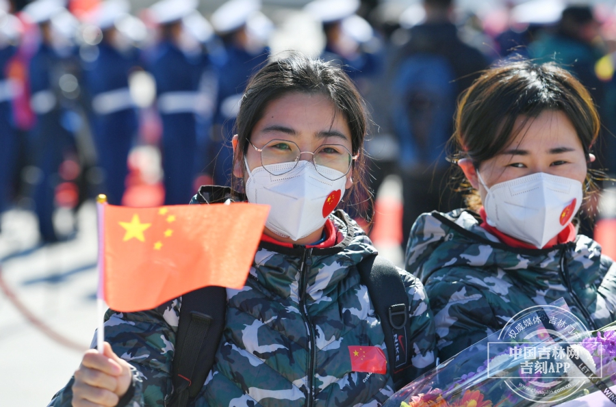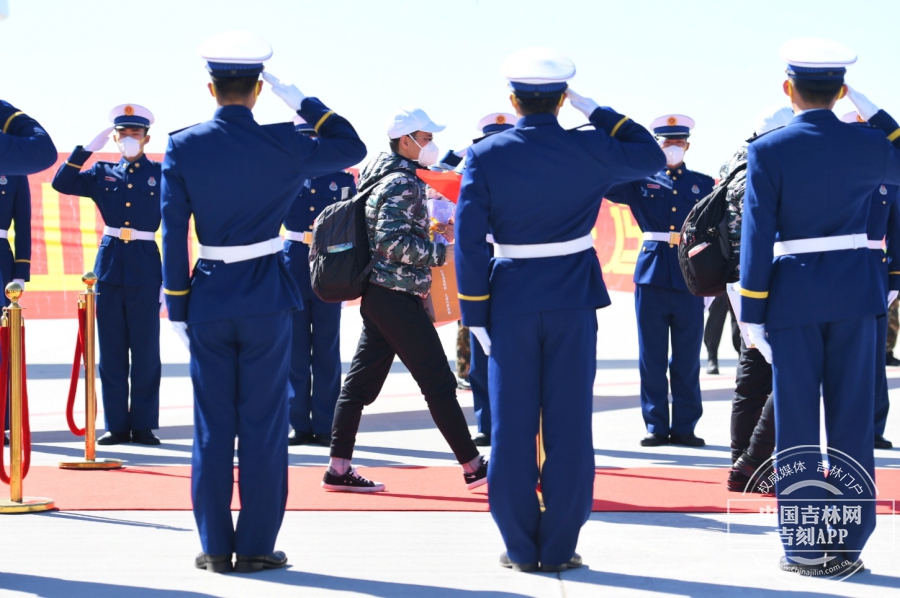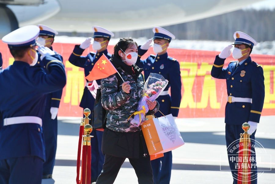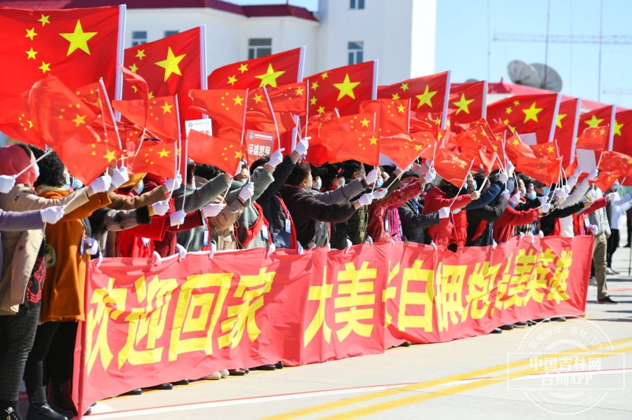 回家的英雄们缓缓走下飞机,等待已久的工作人员送上鲜花和最真挚的祝福。“欢迎英雄,凯旋归来”,欢迎人群大声的呼喊,英雄们向现场的欢迎人群挥手,虽然隔着口罩,但却能感受到他们回到家的喜悦和对欢迎人群的感谢。此刻的长白山机场,就是欢乐的海洋。