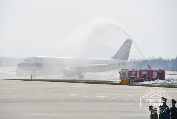 载着返吉英雄的飞机平稳降落在长白山机场,所有人的目光都聚焦在飞机上,滑行、转弯、“过水门”,一系列动作一气呵成。随着飞机到达指定位置,旋梯第一时间衔接,舱门打开。第一位英雄走出舱门,紧接着第二位、第三位……鲜花送到每一位凯旋的英雄手里,同时送达的还有家乡人的热情。