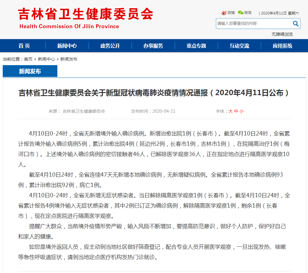 4月10日0-24时,全省无新增境外输入确诊病例。新增治愈出院1例(长春市)。截至4月10日24时,全省累计报告境外输入确诊病例5例,累计治愈出院4例(延边州2例,长春市1例,吉林市1例),在院隔离治疗1例(梅河口市)。上述境外输入确诊病例的密切接触者46人,已解除医学观察36人,正在指定地点进行隔离医学观察10人。