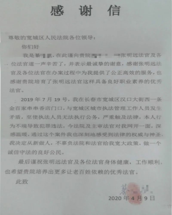 宣判后,被告人綦某为主审法官送来了感谢信。