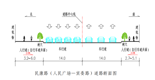 调整优化道路横断面,保持道路双向6车道,取消中央绿化分隔带,新建道路两侧绿化带、自行车道及人行道,取消沿线人行道上不合理停车泊位,保证慢行系统连续。