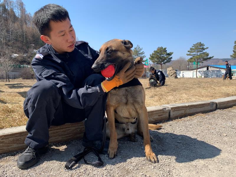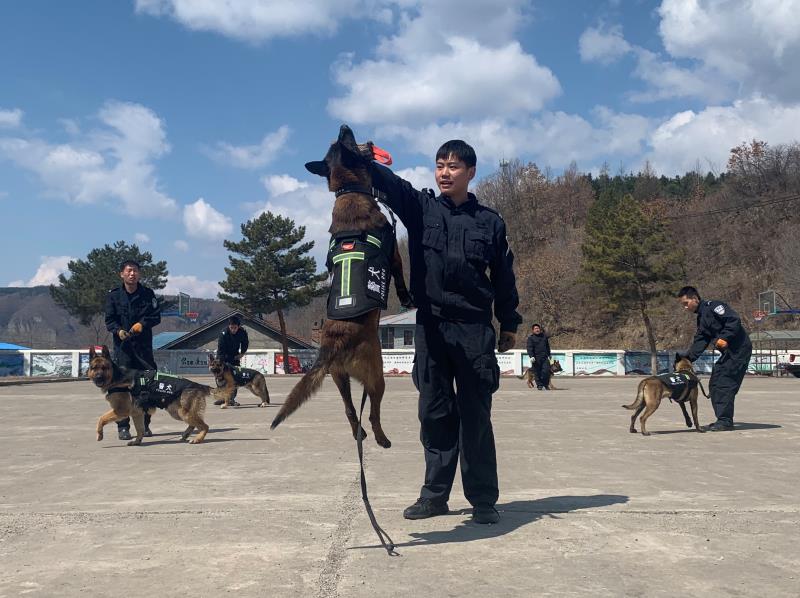 起初,训导员在与自己的警犬接触时,它们偶尔也会耍脾气、偷懒,训导员就会通过做游戏、玩球的方式增进“磨合”,或者采取拿着木棍挑逗的方式增强警犬的体能训练,从而激发警犬的野性和战斗欲望。为了更好地进行“磨合”,训导员们每天天蒙蒙亮就会到犬舍给犬喂食、梳毛、观察它的习性和规律以及进行监护、训练,通过日常的朝夕相处、并肩作战,培养了人犬之间的默契与信任。在训练中,从最开始的服从基本训练科目坐、卧、立、躺、随行等13个口令、30多个发音训练,到“扑咬、注意、袭”等警用实用专业技能训练。