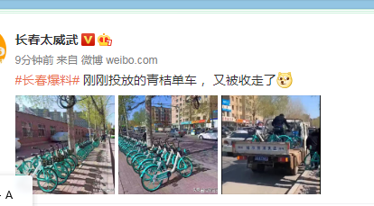 4月25日、26日两天,青桔单车“悄然”出现在长春市内的街头、地铁口,但和之前的“哈啰”有着同样的“命运”,仅几个小时之后,长春市相关部门便对其进行了收缴。