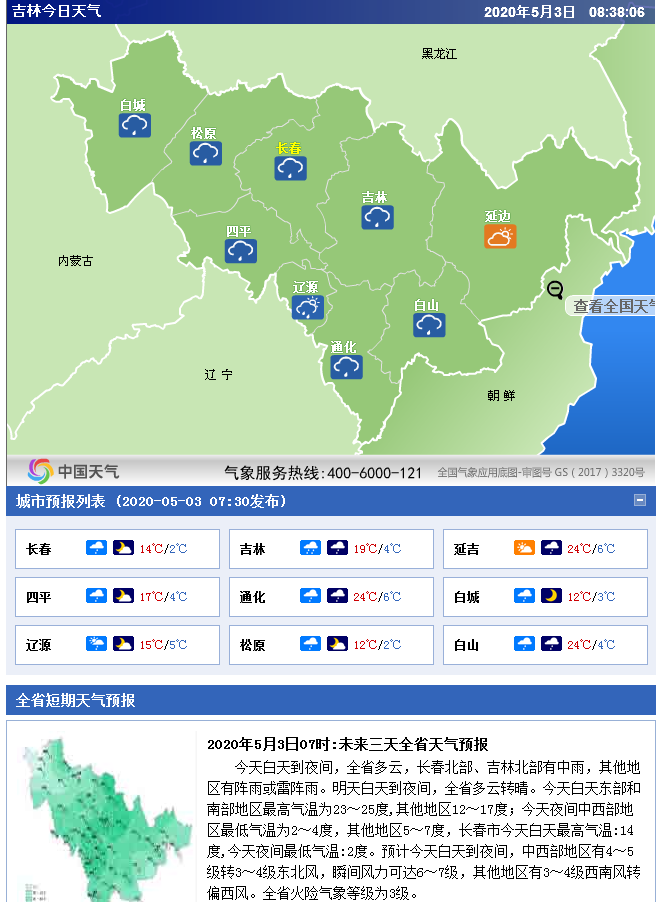 根据中国天气网2020年5月3日07时发布信息显示,今天白天到夜间,全省多云,长春北部、吉林北部有中雨,其他地区有阵雨或雷阵雨。明天白天到夜间,全省多云转晴。今天白天东部和南部地区最高气温为23~25摄氏度,其他地区12~17摄氏度;今天夜间中西部地区最低气温为2~4摄氏度,其他地区5~7摄氏度。长春市今天白天最高气温14摄氏度,今天夜间最低气温2摄氏度。预计今天白天到夜间,中西部地区有4~5级转3~4级东北风,瞬间风力可达6~7级,其他地区有3~4级西南风转偏西风。全省火险气象等级为3级。