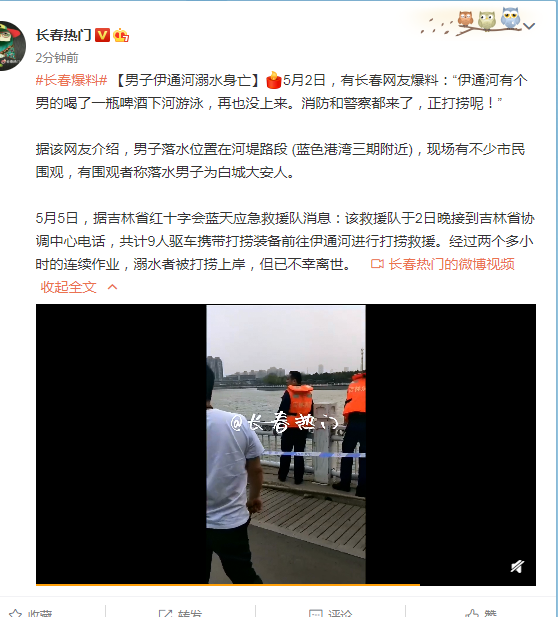 6日,长春微博博主“长春热门”爆料称:“伊通河有个男的喝了一瓶啤酒下河游泳,再也没上来。消防和警察都来了,正打捞呢!据该网友介绍,男子落水位置在河堤路段 (蓝色港湾三期附近),现场有不少市民围观,有围观者称落水男子为白城大安人。”
