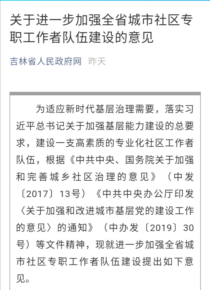 近日,中国吉林网从吉林省人民政府网(http://www.jl.gov.cn/mobile/ )了解到,吉林省将打造一支适应新时代基层治理需要的专业化、职业化的社区工作者队伍 。