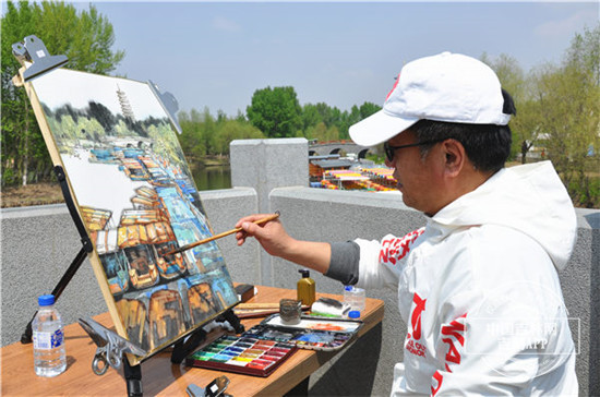 高塔、石桥、流水、船坞、游人......李老师的油画将多个元素融入其中,颜色丰富又充满活力,“这里不仅具有现代气息、时尚色彩,还有古典元素和民族特色,用中西结合的方式,画一幅画来传达北湖的美景。”