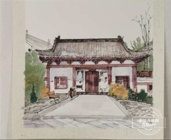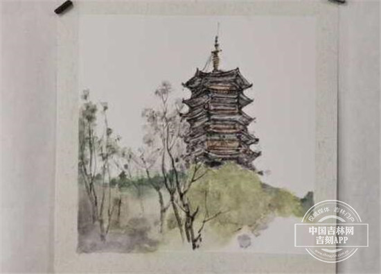 “对称式的构图,周围树木环绕,体现这里安静之感。”崔老师用画作展示出了北湖标志性建筑万寿寺的静谧景致。
