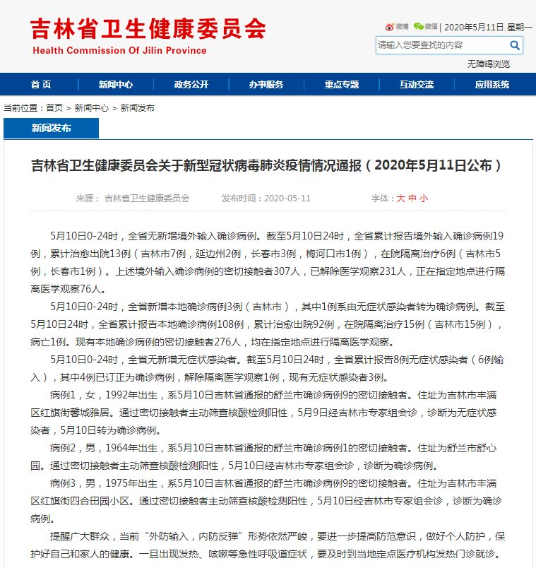 5月10日0-24时,全省新增本地确诊病例3例(吉林市),其中1例系由无症状感染者转为确诊病例。截至5月10日24时,全省累计报告本地确诊病例108例,累计治愈出院92例,在院隔离治疗15例(吉林市15例),病亡1例。现有本地确诊病例的密切接触者276人,均在指定地点进行隔离医学观察。