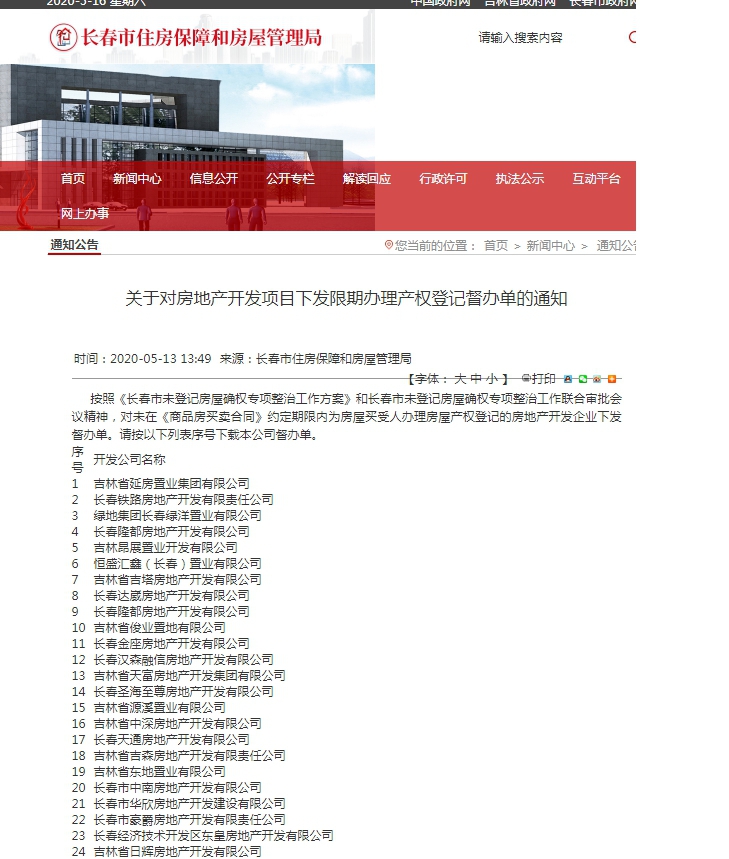 16日,中国吉林网从长春市住房保障和房屋管理局网站发布消息中看到,近日按照《长春市未登记房屋确权专项整治工作方案》和长春市未登记房屋确权专项整治工作联合审批会议精神,对未在《商品房买卖合同》约定期限内为房屋买受人办理房屋产权登记的房地产开发企业下发督办单。