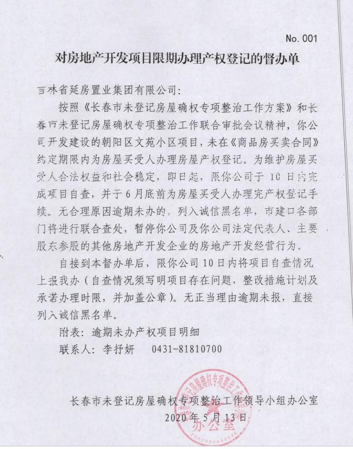 中国吉林网注意到,督办单主要要求明确提出:房企自即日起10日内完成项目自查,并于6月底前为房屋买受人办理完产权登记手续。无合理原因逾期未办的,列入诚信黑名单,(长春)市建口各部门将进行联合查处,暂停该公司及该公司法定代表人、主要股东参股的其他房地产开发企业的房地产开发经营行为。此外,在接到督办单10日内将自查情况上报,无正当理由逾期未报,直接列入诚信黑名单。