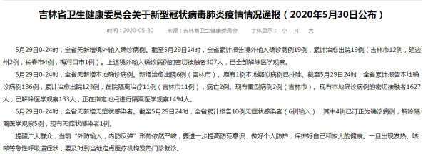 吉林省疫情动态及趋势图示(2020年5月30日公布)