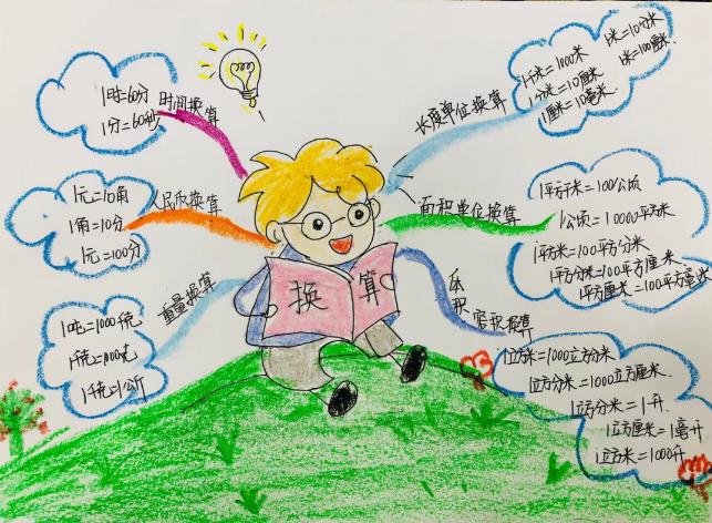四、五、六年级的同学们通过自己设计、自己动手绘制的方式制作单元思维导图或课时思维导图。同学们精心梳理单元知识点把复杂的概念理解、公式运算等知识用思维导图逐层展开。在动手创作的同时,也加深了对知识的理解和应用。一幅幅构思精巧、富于创意的思维导图,让孩子们感受到了数学思维之美。