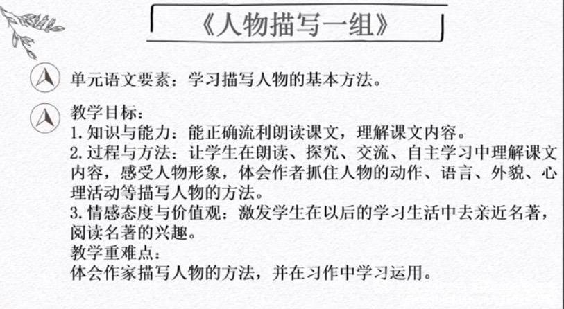 她表示,首先认真研读教材,先从单元学习目标入手。本单元的语文要素是“学习描写人物的基本方法”,《人物描写一组》中的几个片段从不同的角度引导学生体会具体表现人物的方法。