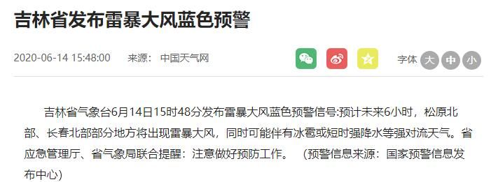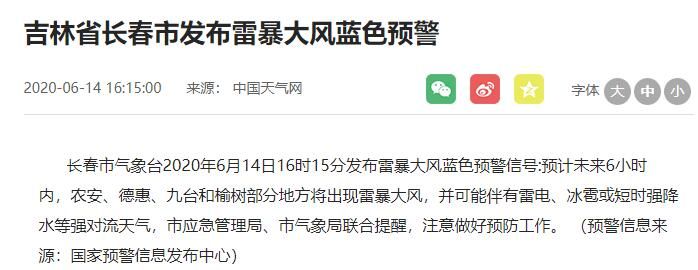 长春市气象台在6月14日16时15分也发布雷暴大风蓝色预警信号:提示6小时内,农安、德惠、九台和榆树部分地方将出现雷暴大风,并可能伴有雷电、冰雹或短时强降水等强对流天气。
