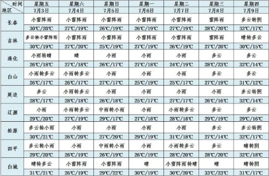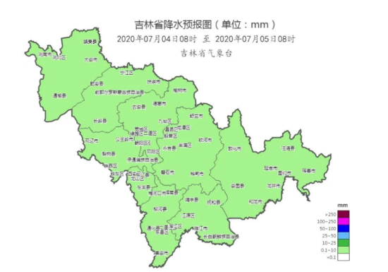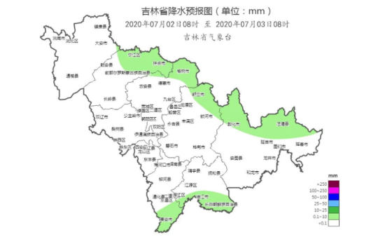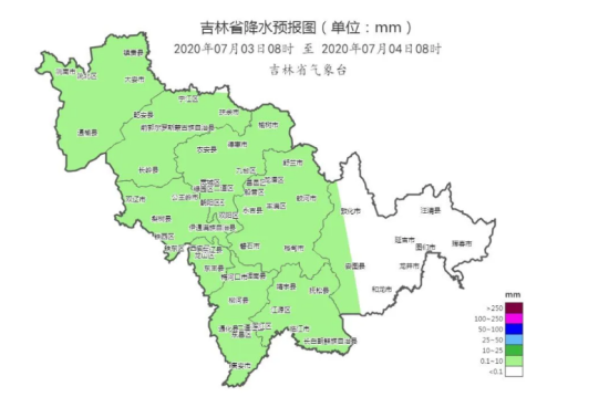 降雨量前十位为:汪清县三道沟村21.3mm,农安县兴隆村16.6mm,蛟河市插树岭11.6mm,蛟河市额勒赫村10.5mm,龙井市船口村9.8mm,白城市白城8.0mm,蛟河市炮手沟村6.6mm,蛟河市前进乡6.1mm,长白朝鲜族自治县沟镇背阴汀村5.3mm,舒兰市朝阳镇4.0mm。