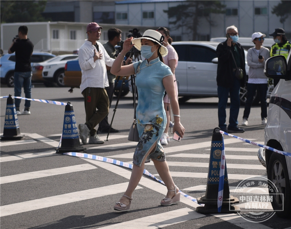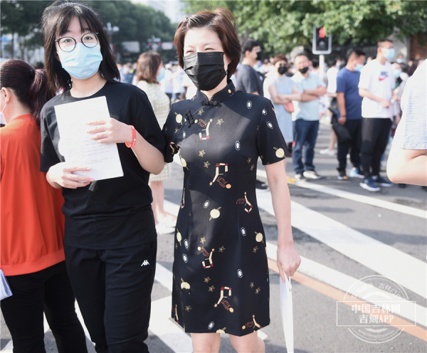在考点外,记者注意到,旗袍几乎成了妈妈们的“标配”,红的、蓝的、墨绿的,各种颜色交相辉映,成为考场外一道独特的风景线。