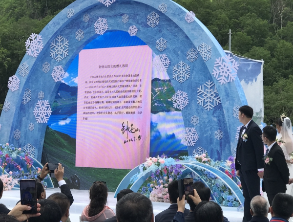 “神山作证”、现场申请“最大人参组成的祝福”吉尼斯世界纪录、“中国工程院院士钟南山、中国科学院院士张洪杰贺喜”、专属红旗轿车车队接亲,亮点纷呈的“2020牵手长白山·浪漫天地间大型集体婚礼”,吸引超万网友的关注,更是收到了全国各地网友满满的祝福。