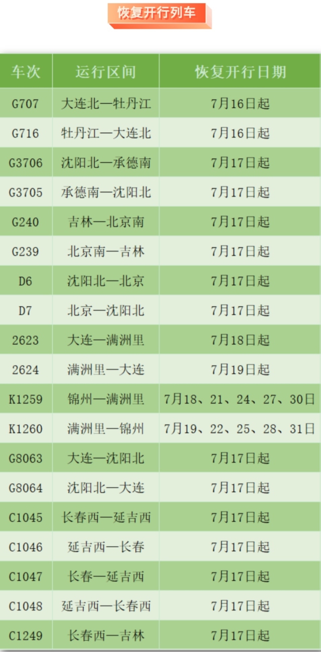 为方便旅客出行,沈阳局集团公司优化调整运输方案,7月16日起,长春、吉林等方向陆续恢复开行19趟旅客列车。
