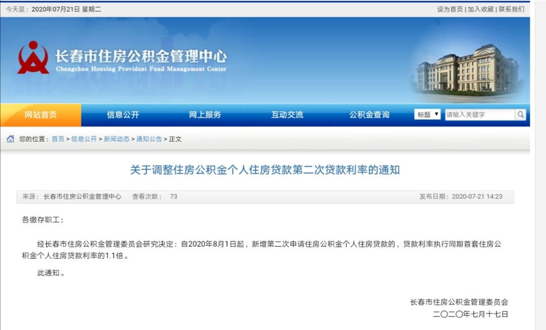 21日,中国吉林网从长春市住房公积金管理中心发布消息中看到,经长春市住房公积金管理委员会研究决定:自2020年8月1日起,新增第二次申请住房公积金个人住房贷款的,贷款利率执行同期首套住房公积金个人住房贷款利率的1.1倍。