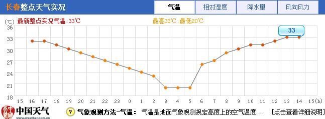 7月25日是2020年三伏中“头伏”的最后一天,长春市的气温也是再创新高,从中心站的数据来看,今天13时开始至15时,最高气温始终维持在33℃。