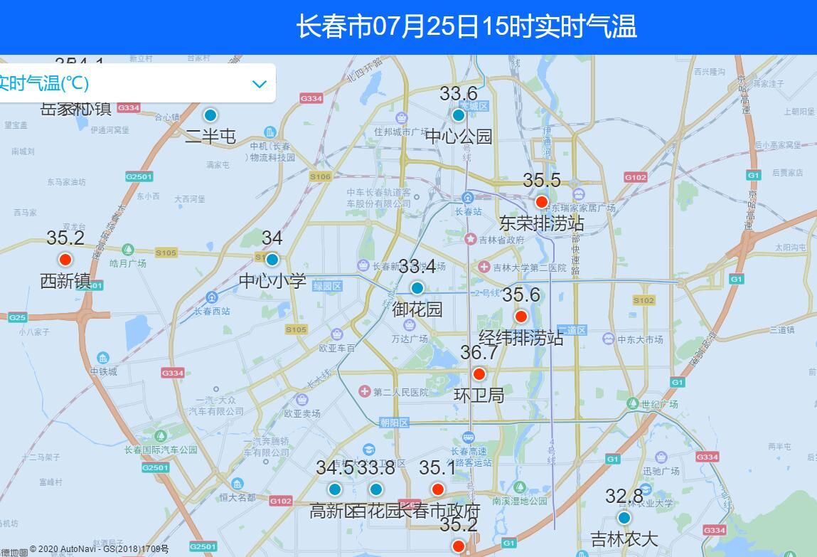 而从长春气象提供的实时气温监测数据来看,15时市内个别站点最高气温已经突破36℃,也是刷新了今夏长春市气温的新高。挥汗如雨已经不足以形容外面的热,因为太阳的“炙烤”感实在太足了,走在外面,有种汗水会马上被蒸发掉的感觉。