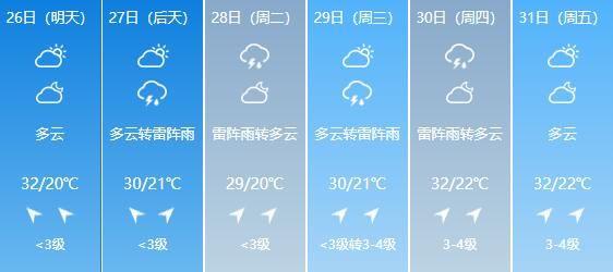 预计未来一周(7月25-31日),全省平均气温24.0℃左右,比常年偏高,且东部地区气温较低。 全省平均降水量为15.0毫米左右,比常年明显偏少。其中27-28日东南部有小到中雨,局部地方有大雷阵雨,其他地区有阵雨或雷阵雨;29日西部和东南部有分布不均的阵雨或雷阵雨;30-31日,全省大部有阵雨或雷阵雨。