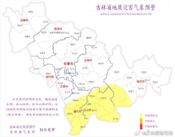 像是吉林省自然资源厅和吉林省气象局2020年8月13日16时就联合发布地质灾害气象黄色预警:今天夜间到明天白天,通化地区大部、白山地区、长白山保护区、延边地区西部发生地质灾害可能性较大(黄色预警),请各单位做好防范工作。